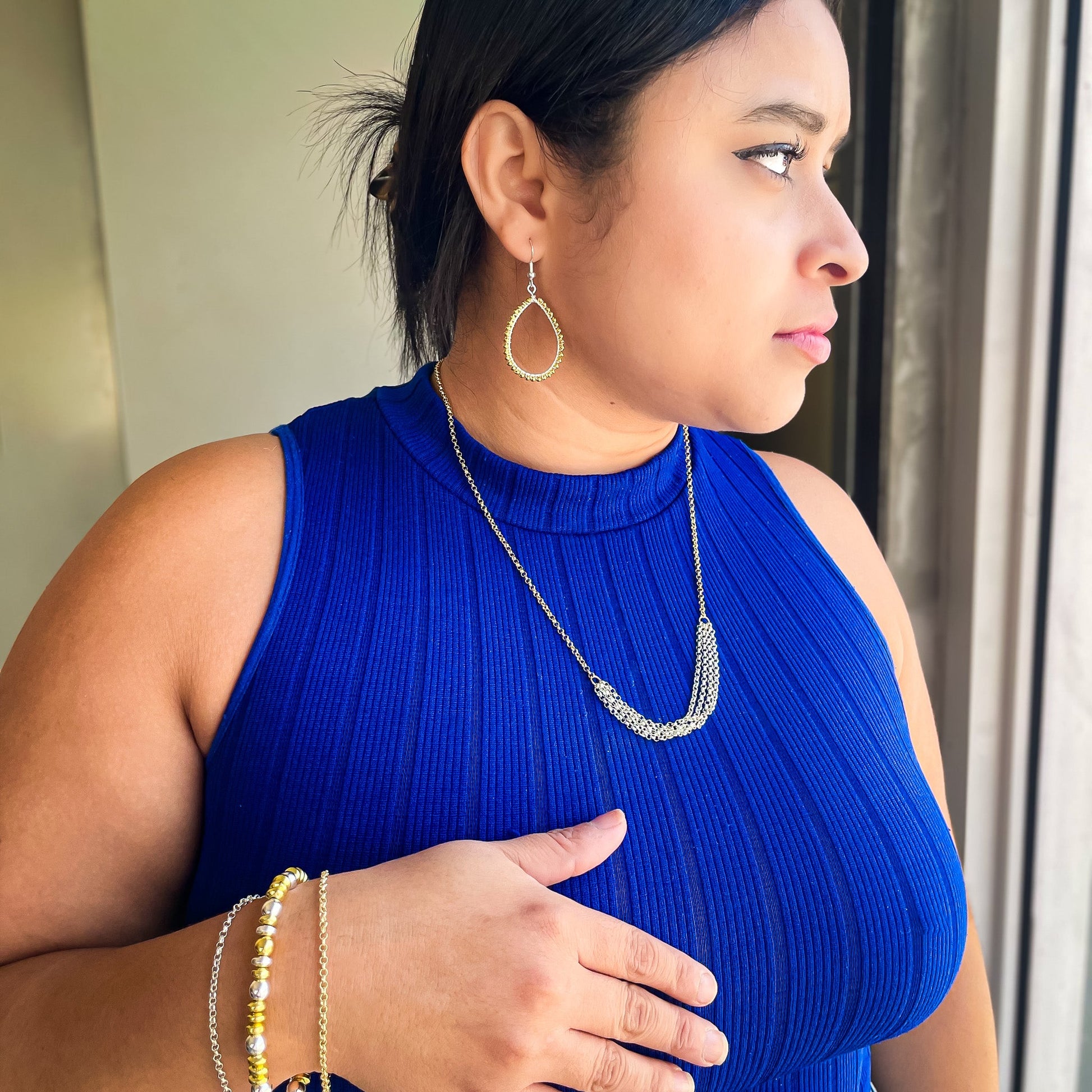 3 strands form a statement bracelet with one silver chain, one gold chain, and a beaded strand of silver and gold round and flat spacer beads. 7 inches with a 1 1/2 inch extender chain and lobster clasp