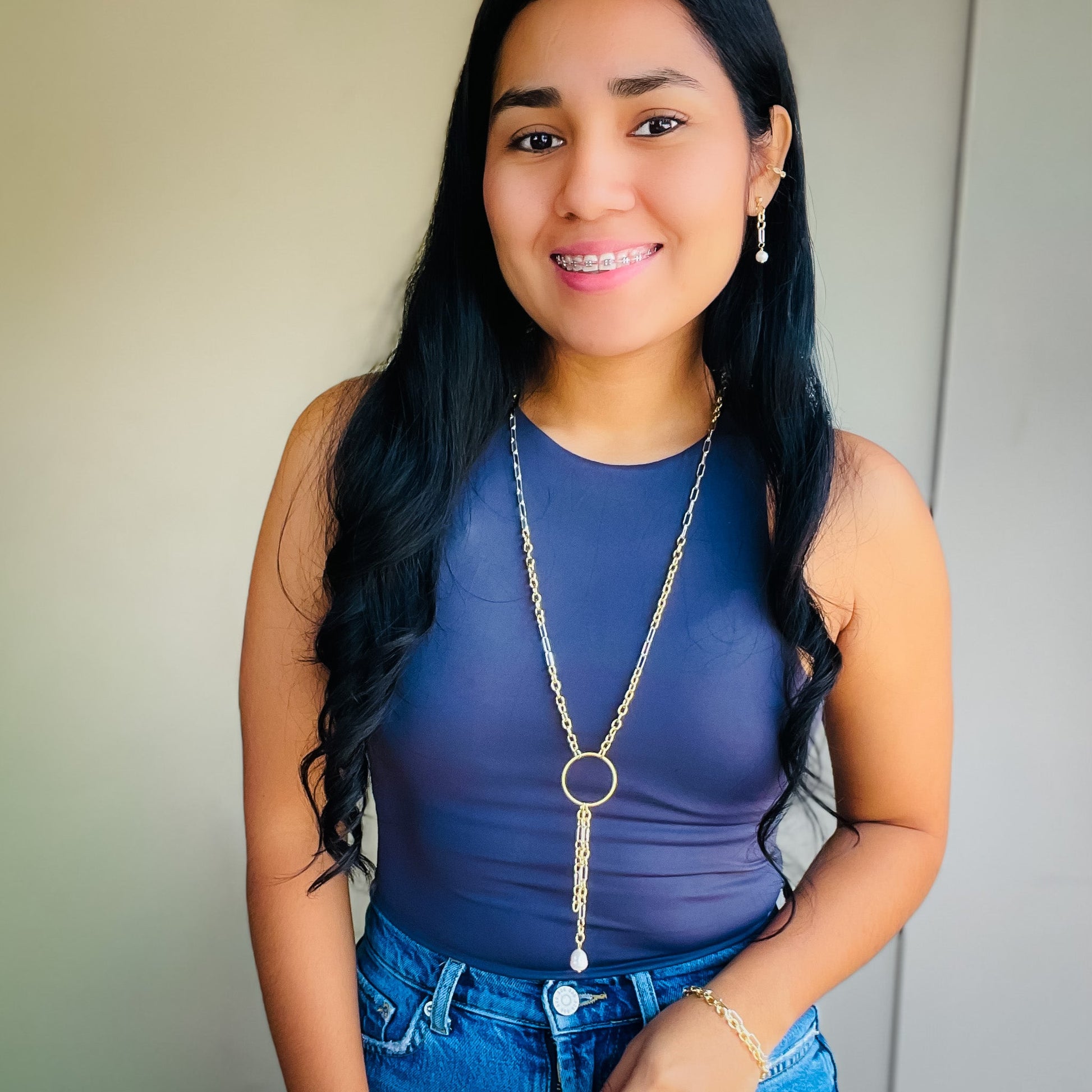 A hypoallergenic gold ball post holds 3 links of chunky gold cable chain, 1 silver paperclip chain link and ends with a freshwater pearl charm. 1 1/2 inch total length.